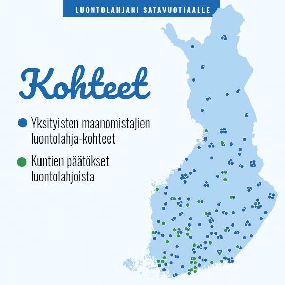 Suomen juhlavuoden kunniaksi järjestettiin Luontolahjani satavuotiaalle -kampanja, joka kannusti maanomistajia perustamaan yksityisiä luonnonsuojelualueita. Uusia suojelualueita perustettiin vuoden 2017 aikana yhteensä 170 kappaletta, jotka ovat yhteensä 3064 hehtaaria. Kampanja ylitti siis reilusti tavoitteensa, joka oli 1800 hehtaaria.