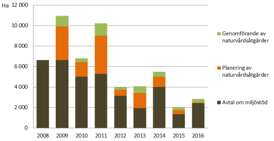 Genom Kemera-lagen skyddades 2016 sammanlagt 2 431 hektar, vilket är över 1 000 hektar mer än föregående år. Skillnaden förklaras delvis med att Kemera-författningarna har ändrats och att Skogscentralens datasystem förnyats med den påföljden att de avtal om miljöstöd som ingicks i slutet av 2015 överfördes till 2016. Miljöstödsobjekten var i genomsnitt 3,5 hektar stora, och största delen av områdena var skogar kring småvatten och moskogar med stort inslag av död ved. De mest betydande insatserna innebar skötsel av lundar, restaurering av småvatten och restaurering av myrar.
