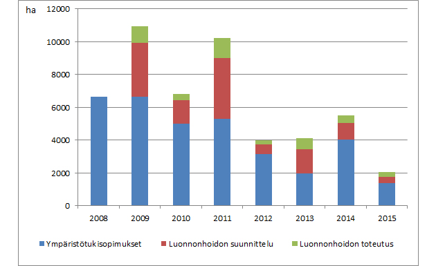 METSO-ohjelmaa toteutetaan myös Kemera-varoin tehtävillä luonnonhoitohankkeilla ja ympäristötuella. Vuonna 2015 ympäristötukisopimusten pinta-ala oli 1 372 hehtaaria, mikä on edellisvuotta vähemmän. Muutos johtui Metsäkeskuksen tietojärjestelmäuudistuksesta, mikä siirsi loppuvuonna tehtävät sopimukset vuodelle 2016.