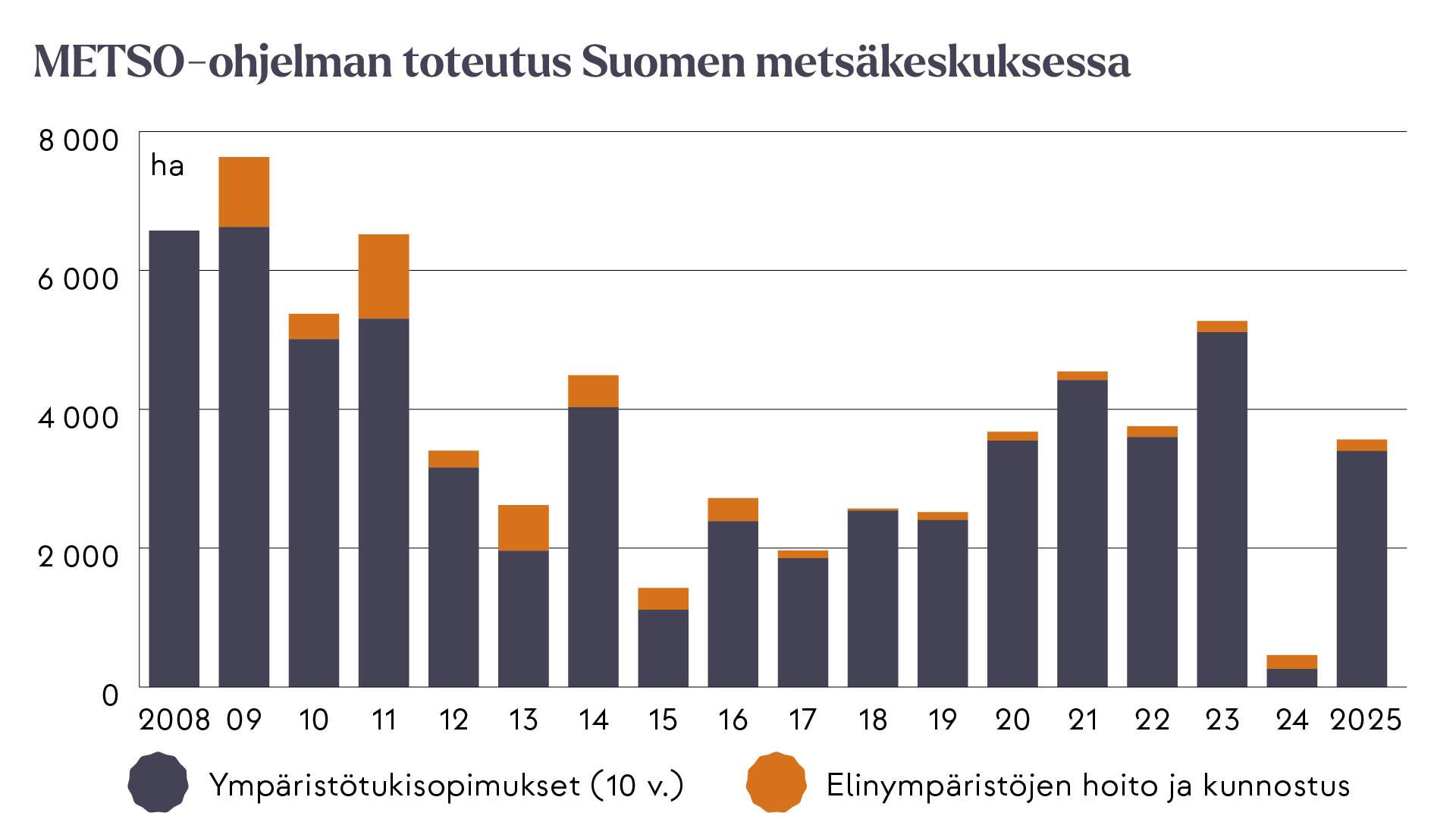 Etelä-Suomen metsien monimuotoisuuden toimintaohjelmassa (METSO-ohjelma) suojeltiin vuonna 2025 kaikkiaan noin 6 600 hehtaaria metsäisiä elinympäristöjä. Suomalaiset metsänomistajat suojelivat viime vuonna pysyvästi noin 3 200 hehtaaria ja tekivät kymmenvuotisia ympäristötukisopimuksia noin 3 400 hehtaarille. Lisäksi luonnonhoitotöitä toteutettiin noin 180 hehtaarilla.