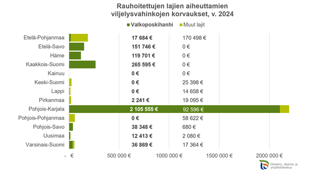 Korvauksista noin 2,75 miljoonaa euroa maksettiin valkoposkihanhien aiheuttamien viljelysvahinkojen korvaamiseksi. Suurin osa valkoposkihanhien aiheuttamista viljelysvahingoista kohdistui Itä-Suomen alueelle. Pohjois-Karjalassa korvauksia maksettiin noin 2,2 miljoonaa euroa ja Kaakkois-Suomessa noin 266 000 euroa. Etelä-Savon ja Hämeen osalta maksetut korvaukset ylittivät myös sadantuhannen euron rajan.