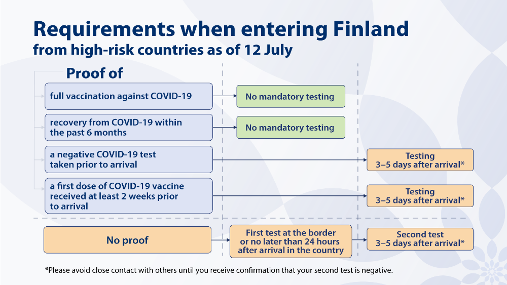 If a person arriving in Finland does not have proof of full vaccination against COVID-19, recovery from COVID-19, a negative test result or a first dose of COVID-19 vaccine received at least 14 days prior to arrival in Finland, they must be tested for COVID-19 as soon as they arrive in Finland and a second time 3–5 days after arrival.