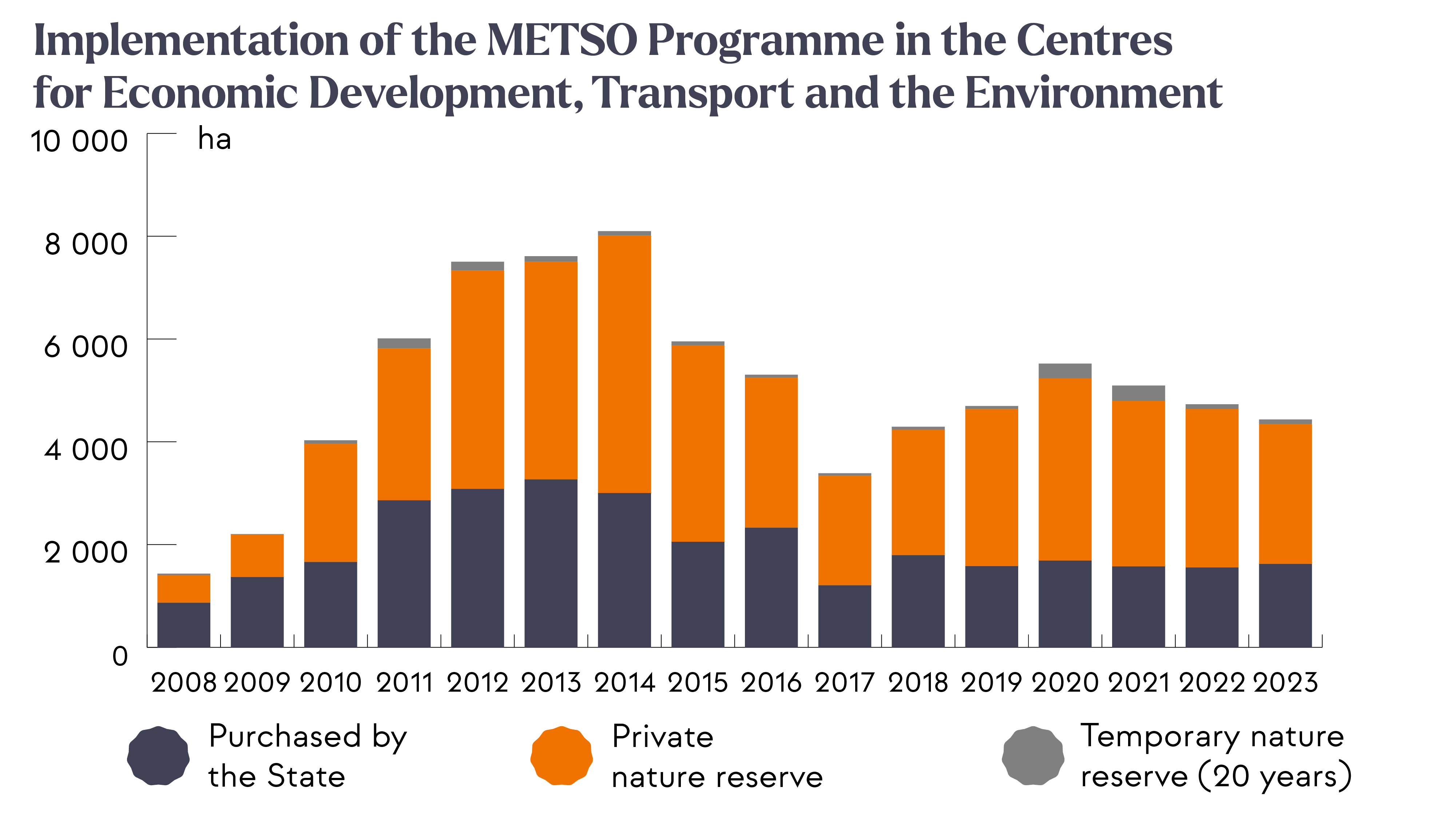 Figures: Implementation of the METSO Programme in the Centres for Economic Development, Transport and the Environment and the Finnish Forest Centre 2008–2023. The figures of the Centres for Economic Development, Transport and the Environment do not include 13,000 hectares of forest protected by Metsähallitus under the METSO Programme in 2014, but this is also included in the results of the programme.