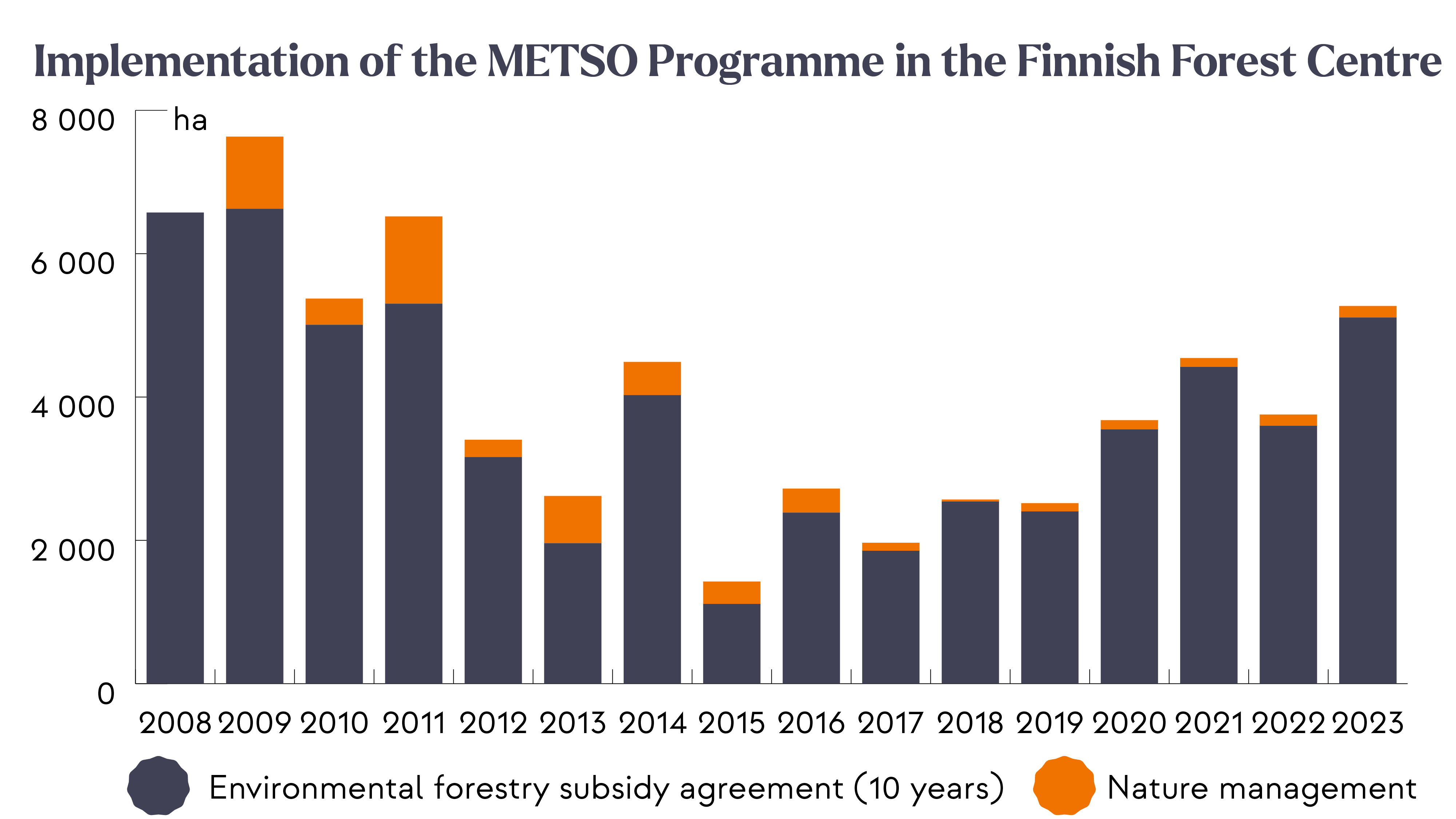 The new forestry incentive scheme METKA replaced the aid for sustainable forestry in the beginning of 2024. Measures under the METSO Programme in the new scheme are environmental aid agreements, aid for forest nature management and aid for prescribed burning. The aim for this year is to conclude agreements and carry out nature management of habitats concerning a total of 3,100 hectares. EUR 14.5 million in total has been reserved to be used for environmental aid agreements and aid for nature management and prescribed burning, of which EUR 2.2 million is to be used for nature management and prescribed burning. Applications under the new incentive scheme can be submitted as from 1 March 2024.