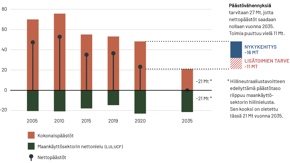 Kansallisen ilmastolain mukaan Suomen nettopäästöjen tulisi olla nollassa tai negatiiviset vuoteen 2035 mennessä. Vuoteen 2030 mennessä kokonaispäästöjä tulee vähentää 60 prosenttia verrattuna vuoden 1990 tasoon. EU-tasolla määritetään Suomen velvoite maankäyttösektorin hiilinielulle ja taakanjakosektorin päästövähennyksille.