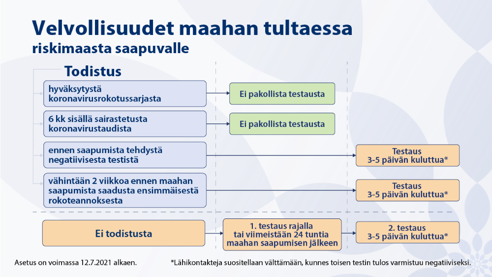 Jos Suomeen saapuvalla henkilöllä ei ole esittää todistusta koronarokotussarjasta, sairastetusta koronavirustaudista, negatiivisesta testitodistusta tai vähintään 14 vuorokautta ennen maahan saapumista saadusta ensimmäisestä rokoteannoksesta, tulee hänen käydä koronavirustestissä heti Suomeen saavuttuaan ja toisessa testissä 3–5 vuorokauden kuluttua maahan saapumisestaan.