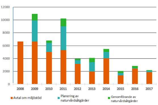 En del av Skogscentralens anslag för 2017 användes aldrig på grund av anhopningen av ansökningar i slutet av året och försenade redovisningar för projekt som utfört naturvårdande skötsel, men dessa medel har överförts så att de kan användas 2018. Avsikten är att engagera ett större antal aktörer i beredningen av miljöstödsansökningar genom att erbjuda dem utbildning och experthjälp med tanke på uppdraget.