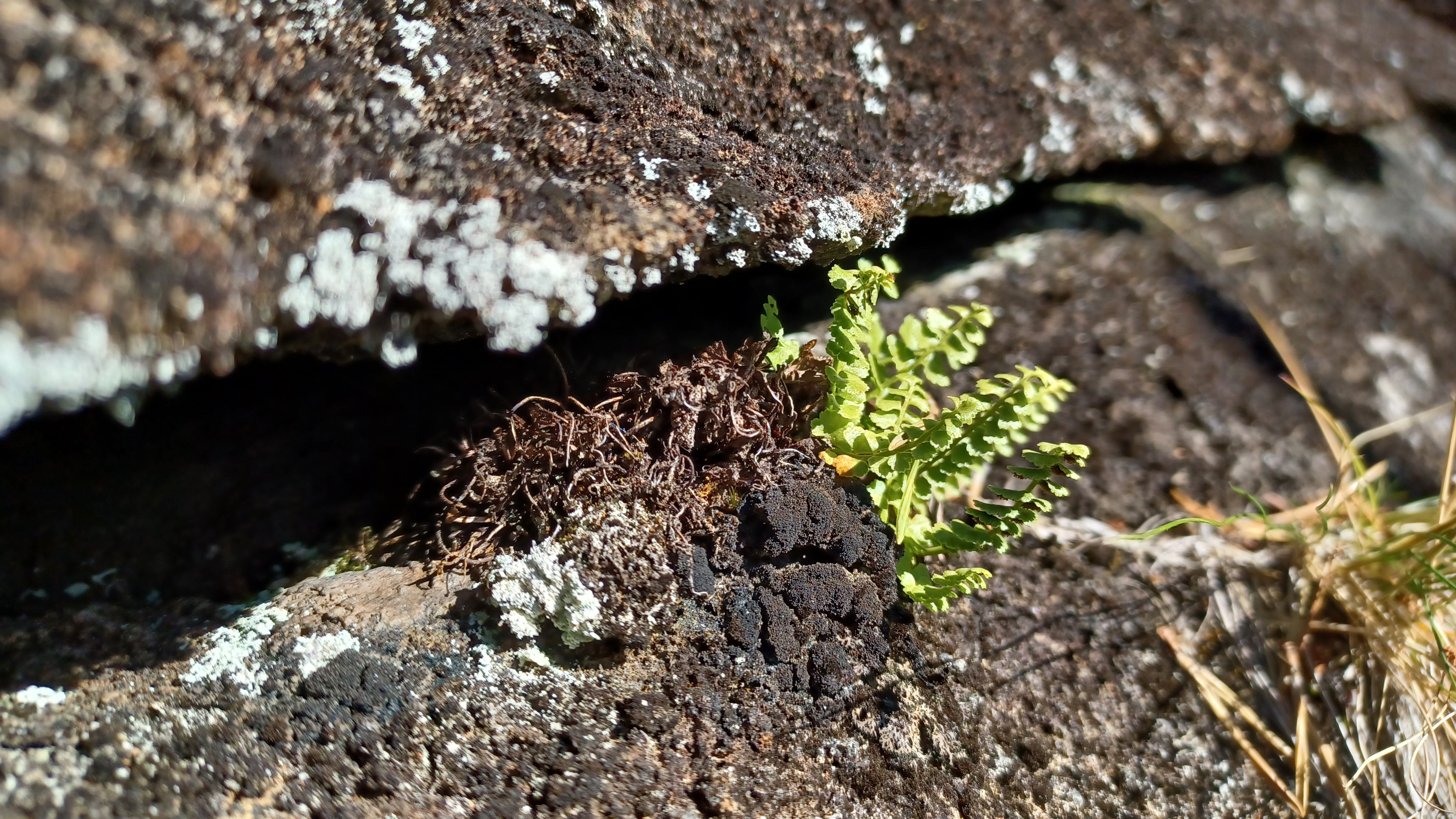Kuvaaja: Essi Lyytinen, paikka Sodankylän Sattasköngäs. Kuvateksti: Serpentiinikallioilla tulee kivilajin lisäksi esiintyä luontotyypille ominaista lajistoa. Kuvassa karstajäkälä ja viherraunioinen.