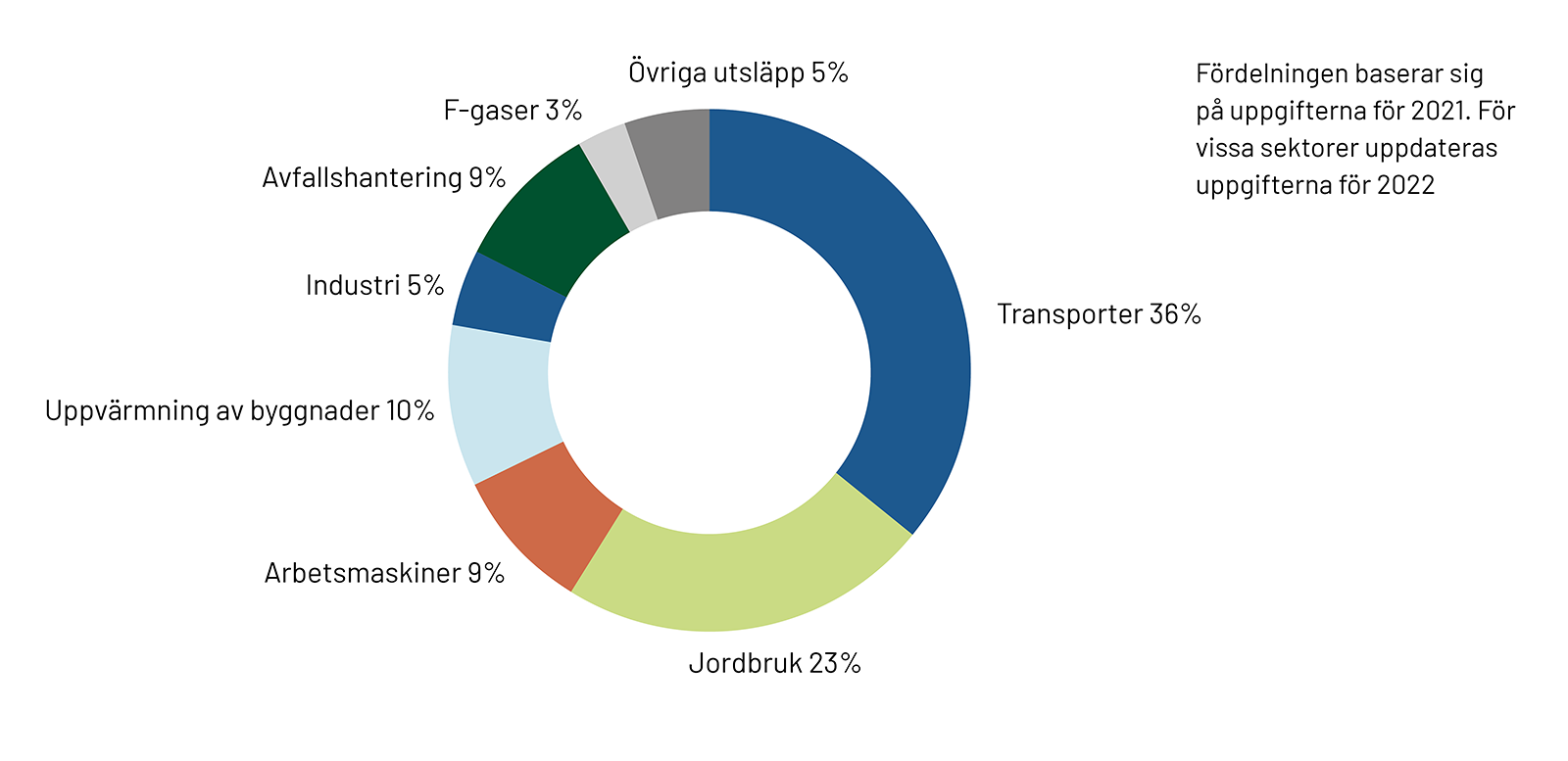 År 2024 utgjorde utsläppen från ansvarsfördelningssektorn cirka hälften av Finlands nettoutsläpp. Utsläppen från trafiken ökade med fyra procent från året innan, eftersom distributionen av förnybara bränslen sjönk jämfört med året innan. Utsläppen från trafiken påverkas särskilt av distributionsskyldigheten i fråga om förnybara bränslen.