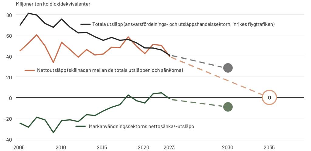 Enligt vår nationella klimatlag ska Finlands nettoutsläpp vara noll eller negativa före 2035. Fram till 2030 ska de totala utsläppen minskas med 60 procent jämfört med 1990 års nivå. Finlands skyldighet i fråga om markanvändningssektorns kolsänka och ansvarsfördelningssektorns utsläppsminskningar fastställs på EU-nivå.