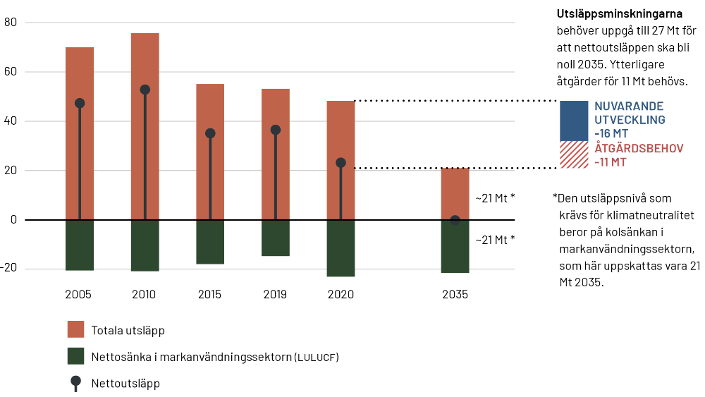 Enligt den nationella klimatlagen har Finland som mål att vara koldioxidneutralt 2035. Då ska Finlands utsläpp och sänkor vara i balans, det vill säga att utsläppen av växthusgaser ska vara högst lika stora som upptagen. Det krävs omfattande ytterligare åtgärder för att uppnå målet att bli koldioxidneutralt. Sänkorna bör stärkas och utsläppen minskas särskilt inom markanvändningssektorn, där utsläppen för närvarande ökar. Klimatlagen innehåller också utsläppsminskningsmål för ansvarsfördelningssektorn och utsläppshandelssektorn för 2030, 2040 och 2050. I klimatårsberättelsen granskas hur målen har uppnåtts under en tidsperiod på 15 år. Fram till 2030 ska de sammanlagda utsläppen från utsläppshandelssektorn och ansvarsfördelningssektorn minskas med 60 procent och fram till 2040 med 80 procent jämfört med 1990 års nivå.